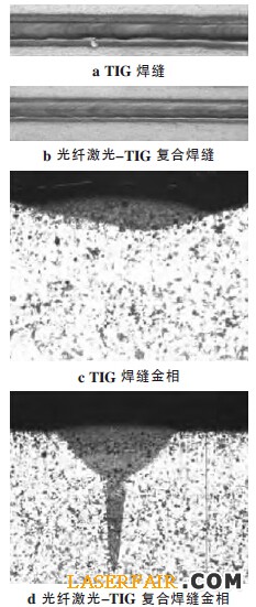 激光-TIG 複合焊相對於單獨激光焊,焊接熔深增加了近兩倍,並且焊縫凹陷減小,更加飽滿,很好的展示了光纖激光-TIG 複合焊對工件間隙的適應能力。光纖激光-TIG 複合焊接技術引入了電弧熱源,擴大了熱作用範圍,熔化金屬增多,橋接能力增強,降低了對工件裝配精度的要求,減小了激光焊接技術應用成本,改善了焊縫質量,增加了光纖激光焊接技術的應用範圍。