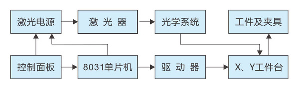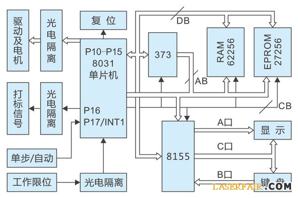 激光打標機數控係統的控製器選用8031 單片微機。硬件框圖如圖2所示。