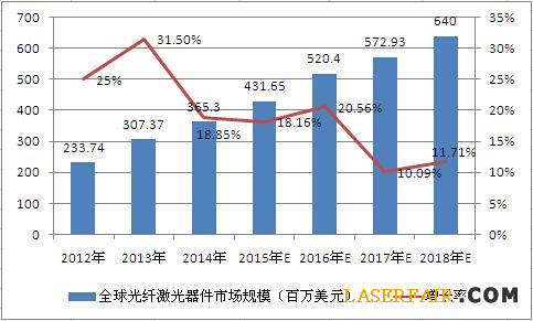 2012---2018年全球光纖激光器器件市場規模(單位:百萬美元)