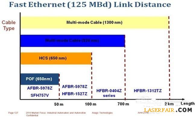 由於光纖鏈路媒介基本上采用玻璃或塑膠,因此在絕緣和隔離特性上遠比常見的銅電纜優秀許多,原因是它們不會受到EMI的幹擾,如圖2中以紅色標示的5米長POF或100米長HCS光纖就提供了高噪聲環境下相對於銅電纜線的許多優勢。采用光纖解決方案,在光纖本身或者是光纖和銅電纜間不會有相互幹擾問題,使得數據傳輸更加安全。光纖對於閃電電擊有較高的耐受力,並且有助於消除接地環路所造成的錯誤,在麵臨惡劣條件或可能暴露的環境時,適當使用光纖解決方案可以藉由通過降低閃電電擊可能帶來的損害以及電氣火花造成的衝擊而提高安全性。