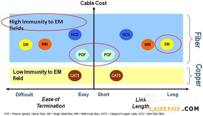 另外,以塑料光纖為例,在安裝時不需特別的工具,並且訓練也非常容易,POF光纜已經被應用在各種惡劣的工業環境,例如汽車組裝等超過15年,POF也適合短距離到中等距離鏈路應用,並且非常容易於現場安裝,有助於簡化設備和現有網絡的連接,工業應用中另一個關鍵設計優勢是維護成本非常低。