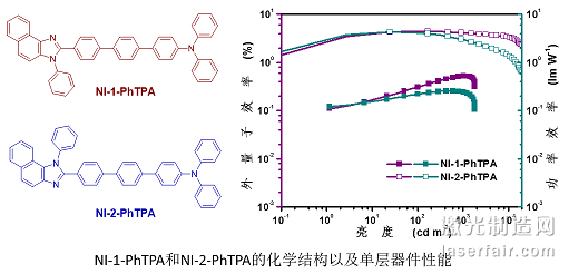 要實現高效率的單層結構器件,對發光材料的特質有著比較苛刻的要求。該材料必須同時具備高的熒光量子效率、良好的電子和空穴傳輸性能以及容易從陰極和陽極注入載流子的特性。從構築雙極性分子的角度出發,結合傳統的空穴傳輸性單元三苯胺和該課題組新開發的電子傳輸性單元萘並咪唑,合成出新型的藍色熒光材料NI-1-PhTPA和NI-2-PhTPA。NI-1-PhTPA和NI-2-PhTPA的區別僅在於,所含有的萘並咪唑單元的構型有所不同。但除此之外,它們的分子軌道能級和熒光量子效率均非常接近。然而令人感到意外的是,這兩個材料在單層器件中所表現出的性能有著十分巨大的差異。基於NI-1-PhTPA的單層結構器件啟亮電壓為3.0 V,最大外量子效率隻有0.52%。而基於NI-2-PhTPA的單層結構器件啟亮電壓僅為2.7 V,最大亮度超過10000 cd m-2, 最大外量子效率達到4.37%。這一性能甚至超過了許多現有報道的多層結構熒光器件的效率。利用X射線和紫外光電子能譜技術,可以發現NI-2-PhTPA中萘並咪唑單元所含有的裸露氮原子與陰極能夠產生某種配位作用,降低了來自陰極的電子注入勢壘,從而獲得了良好的載流子平衡,而NI-1-PhTPA則不具備這種特性。此外,利用這兩個材料作為非摻雜發光層,並引入電子傳輸層和空穴傳輸層製備多層結構器件,由於多層結構器件相似的電子和空穴注入特性,兩個器件表現出十分相近的驅動電壓和效率,外量子效率分別達到6.08%和5.95%,發光顏色均為接近NTSC標準藍光色度坐標的深藍光。