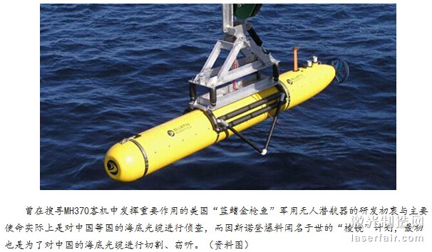 在上世紀90年代中後期的絕密行動中,美特工人員乘特製潛艇進入中國近海,成功在艇內對一段中國光纜進行了切割與竊聽,盡管當時尚不能處理光纜傳輸的大量信號,但美國由此掌握了在中國光纜運營商毫無察覺的情況下,在深海切割、竊聽光纜的技術。不僅如此,於2005年服役的“海狼”級核潛艇“吉米卡特”號加長艇體中的多用途特種作戰平台,同樣具備在海底對光纜進行切割竊聽的能力。同時“吉米卡特”號核潛艇還能發射數艘袖珍潛艇潛至更深海域對中國光纜進行竊聽,並為核潛艇主計算機破解竊聽信號。具體監聽位置可能位於日本、新加坡臨近海域。甚至曾在搜尋MH370航班中發揮重要作用的“藍鰭金槍魚”軍用無人潛航器(UUV)的研發初衷與主要使命,也是對中國的海底光纜進行監聽。