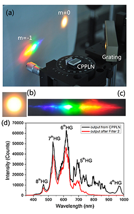 課題組用中紅外飛秒脈衝激光器進行實驗,當中紅外的飛秒激光(脈衝寬度115 fs, 平均功率20 mW, 帶寬3400-3800 nm, 重複頻率1 kHz,峰值功率0.17 GW)進入啁啾結構的樣品後,在輸出端看到了一個非常亮的白光光斑,用光柵對輸出光進行分光得到了0階和-1階的衍射光斑(圖3),充分反映了從啁啾結構樣品輸出的光具有超連續寬帶的可見光分布。經仔細的分析和計算,得到晶體內部的轉換效率約為18%(可見光波段400-800 nm),遠高於用強激光轟擊原子氣體和等離子體獲得高次諧波的轉換效率。其中,各階諧波的轉換效率分別為:四次諧波(850-950 nm)~0.7%, 五次諧波(660-850 nm)~4.5%,六次諧波(560-660 nm)~7.2%,七次諧波(485-560 nm)~5.1%,八次諧波(350-485 nm)~1.2%。實驗結果表明,經過特殊的設計,高階諧波的轉換效率可遠高於低階諧波。