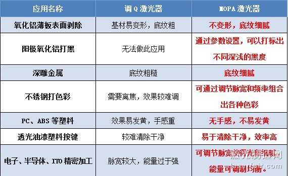 除了以上的幾個應用案例外,MOPA激光器與調Q激光器還存在很多不同的應用差別,在這裏列舉了一部分典型的應用案例,如下表格: