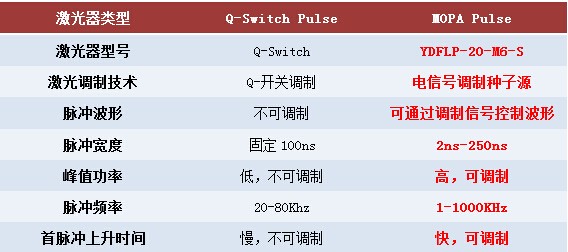 這裏選用市場上比較典型的調Q類型的激光器和深圳市傑普特激光的M6係列MOPA類型激光器的參數作為對比: