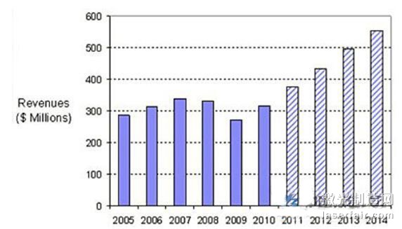 圖1 功率在1kW以下各種中紅外激光器的市場營業收入