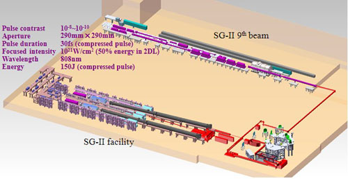 為拓展神光II激光裝置未來提供物理實驗的能力,上海光機所高功率激光物理聯合實驗室於2014年中期,依托神光II裝置八路中的一束和神光II第九路激光,采用全OPCPA技術設計了數PW的超短脈衝激光實驗平台。該係統依據目前所能獲得的最大尺寸的壓縮光柵,設計最大輸出峰值功率大於5PW,壓縮脈寬小於30fs,聚焦焦斑8μm內能量集中度大約為50%。