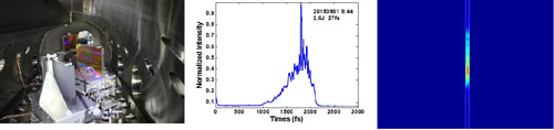 2015年4月20日-5月10日數PW激光第一次聯機實驗,實現了OPCPAI、OPCPAII全鏈路貫通,並獲得了OPCPAII的放大信號。在壓縮器安裝和調試完成之後,於8月10日-9月2日進行了第二次聯機實驗,本次聯機實驗實現了除OPCPAIII單元之外的OPCPAI、OPCPAII和壓縮器的全鏈路調試。聯機實驗中,OPCPAII單元共實現了50發的大能量發射,神光II泵浦光倍頻效率最大~65%,泵浦光最大輸出能量130J,信號光脈衝輸出單脈衝能量最大超過了30J,壓縮後脈衝寬度小於30fs,最短24fs。