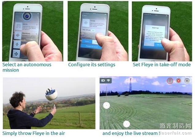 而且,Fleye 操作起來也異常的容易。帶上你的手機,點開對應的 App 選擇好工作模式,就可以把它丟到空中了。他可以實現自拍、全景、虛擬三腳架等多重功能,絕對比很多天天在微博裏裝 13 的那些自稱圈兒裏老人兒牛 X 得多。