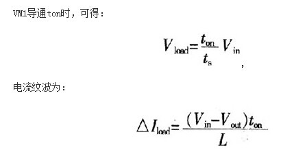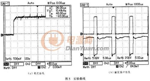 由電流紋波公式可知,增大電感、減小ton都可以減小紋波。為了不提高電感容量,實驗中采用200kHz的工作頻率,其中電感選用4.8-μH,根據公式可得激光管壓降2V時紋波電流約為1000mA。