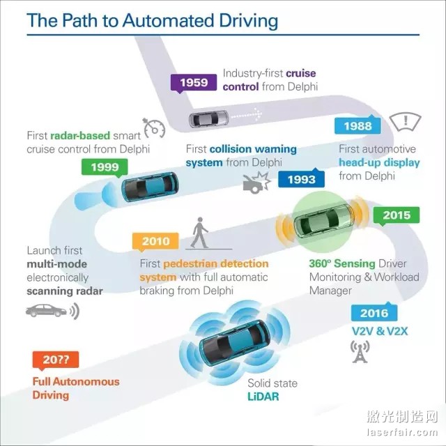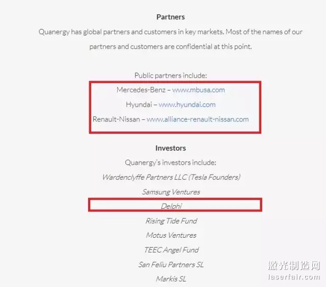 說到激光雷達產品,給人的第一印象就是它不可能很快的在汽車上量產。因此基本上主流的激光雷達公司的主營業務都不是汽車。比如Velodyne作為一家矽穀公司,雖然參加了多次無人駕駛挑戰賽,但其大客戶仍然是工程機械公司,比如卡特彼勒。而IBEO這家德國公司的主營業務則仍然在工業安防保護上。因此汽車業務上,IBEO和傳統汽車零件供應商法雷奧展開了深度合作。那麽來自矽穀的Quanergy公司呢?首先要說說創始人Eldada博士。Dr. Eldada是哥倫比亞大學電子工程專業的博士,專攻低成本高精度激光雷達方向。其專業性從他發表的SAE汽車工程師協會論文和文後提到的相關專利可見一斑。但如前所說,即使有好的產品在汽車應用中短期盈利也是很難的。如下圖一所示來自Quanergy官方的投資信息可以看到,主要的合作夥伴包括奔馳、現代、雷諾尼桑。而投資方列表中傳統汽車零件供應商德爾福Delphi赫然在列。有了強大的投資方,加上自身獨創性的技術,這就是Quanergy在汽車行業生存的資本。如下圖二所示,德爾福也在其無人駕駛技術路線圖上提到了相應的固態激光雷達概念,而其中的合作夥伴就是Quanergy公司。路線圖從1959年最早的巡航控製開始,包括抬頭顯示、碰撞預警、最早基於雷達的自適應巡航係統、多模式電子掃描雷達、最早帶行人保護功能的緊急刹車係統、360度駕駛監控係統,再到此次CES 2016發布的車車通訊V2V & 互聯互通係統V2X,以及這裏提到的固態激光雷達。這些最終組成了德爾福提供的通向完全無人駕駛的解決方案。