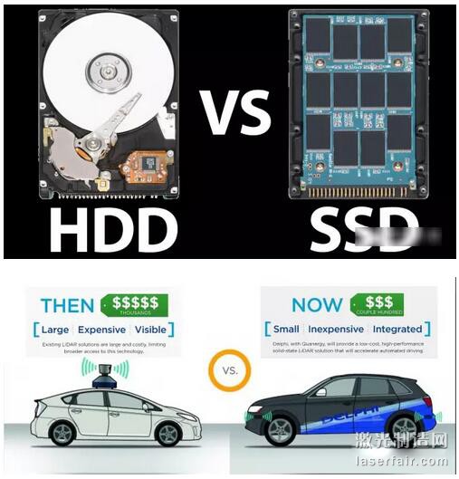 那麽這裏“固態”到底是個什麽概念呢?難不成還對應液態不成?實際上下圖一對應了我們身邊最直接的例子,右側的“固態”硬盤SSD內部沒有機械旋轉部件,所以體積小穩定性高。對應的左側“機械”硬盤HDD內部基於機械旋轉部件進行數據讀寫的方案。因此“固態”概念可以稱為基於電子部件,無機械旋轉部件的解決方案。如下圖二所示,左側最早由穀歌提出的無人駕駛汽車,基於置於車頂的360度機械旋轉激光雷達實現。它的性能非常好,但是相應的也具有成本過高(幾千美元級別),體積大、外部可見等劣勢。右側對應的“固態”激光雷達產品則由於采用電子方案去除了機械旋轉部件,因此具有低成本(幾百美元級別)和體積小、可集成至傳統車輛外觀中的特點。