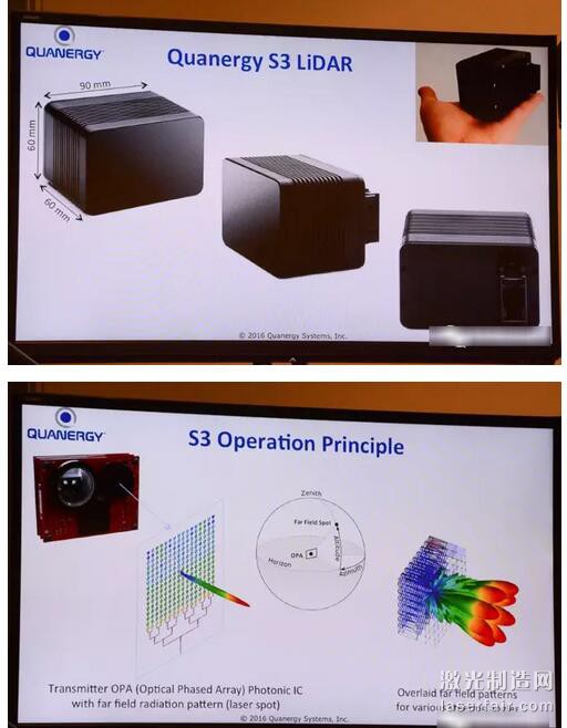 實際上奧迪早在去年的CES2015就由技術總監提出了激光雷達小型化的概念。隻是當初還未引入“固態”激光雷達概念而已。如下圖一,奧迪技術總監正手握來自IBEO的小型化激光雷達產品進行展示,下圖二,由於IBEO與傳統汽車供應商法雷奧Valeo的合作,最終量產將由法雷完成。下圖三為裝配了這款小型化激光雷達產品SCALA的奧迪A7 Piloted Driving無人駕駛概念車。實際上從內部結構來看,其小型化的實現方法也是盡量減少內部旋轉部件,而外觀上無可見的機械旋轉部件。因此應該也可以算作“混合固態”激光雷達。類似的還有Quanergy的第一代激光雷達產品MARK VIII也是如此,該產品與2014年下半年應用於奔馳的無人駕駛測試車。