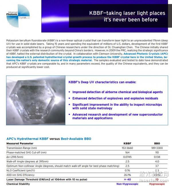 KBBF在高功率狀態下紫外線性能比上一代BBO晶體性能好兩倍,並能夠用於製造超高速激光掃描設備,這將大大提高美國國防和國土安全威脅探測能力,對美國科學研究和精密測量能力的提高而言,KBBF具有“規則改變者”的意義。目前APC公司還在繼續進行這種產品的開發。(APC公司聲明譯完)