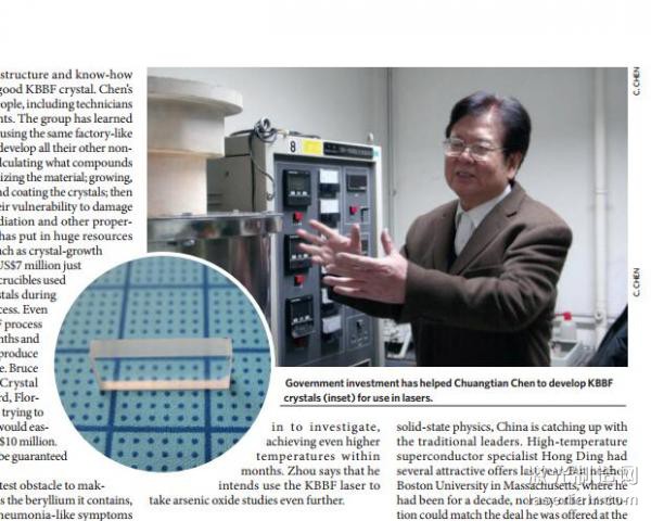 報道提到,上世紀90年代初,在發現硼酸鹽係列非線性光學晶體後,中科院院士陳創天的研究團隊經過十餘年的努力,在國際上首先生長出大尺寸KBBF晶體。