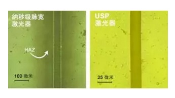 portant; word-wrap: break-word !important;">在封裝切割應用領域,工作波長為(wei) 532 nm(綠光)的皮秒級超短脈衝(chong) (USP) 激光通常可產(chan) 生良好的加工效果,因此正逐漸成為(wei) UV 納秒級激光的替代技術。這是因為(wei) 其超短脈寬可產(chan) 生極高的峰值功率(兆瓦以上)。這種高峰值功率可使加工材料的化學鍵瞬間斷裂。此外,由於(yu) 激光器僅(jin) 在極短的時間內(nei) 工作, 材料中的電子無法將其以熱能傳(chuan) 輸到晶格振動以產(chan) 生熱能。這種工藝組合也因HAZ 最小被稱為(wei) 冷加工(圖2)。另外,綠光皮秒超短脈衝(chong) 激光器加工產(chan) 生的碎屑小而少,隻需采用非常經濟的清理方法即可清除。