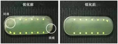 portant; word-wrap: break-word !important;">圖 4. 綠光 超短脈衝(chong) 激光器切割指紋傳(chuan) 感器,工藝優(you) 化前後。工藝優(you) 化基本上消除燒灼和碎屑(白層)。所示樣本未經過清理。