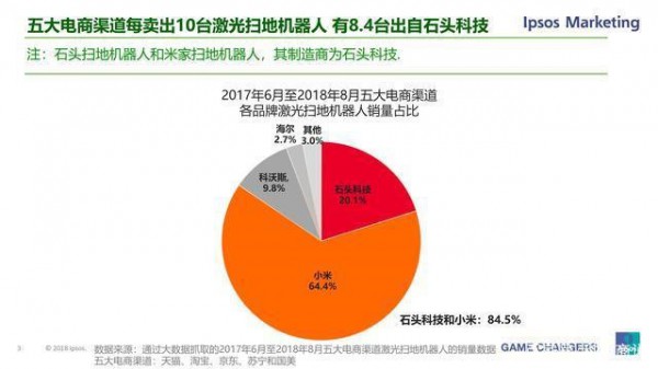 這份2017年6月——2018年8月五大電商渠道個(ge) 品牌激光掃地機器人銷量占比數據顯示:小米掃地機器人占比64.4%,石頭科技掃地機器人占比20.1%,科沃斯掃地機器人占比9.8%,海爾掃地機器人占比2.7%,其他占比3%,可以說小米和石頭科技成了最大贏家,直接占據了84.5%的市場份額。並且小米掃地機器人其實也是石頭科技製造的,也就是說石頭科技間接占據了84.5%的份額,也就是說每賣出10台激光掃地機器人有8台出自石頭科技,可以看出這個(ge) 品牌的產(chan) 品確實是很受消費者喜歡!