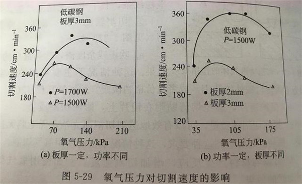 當板厚一定時,存在一個(ge) zui佳氧氣壓力,使切割速度zui大;當激光功率一定時,切割氧氣壓力的zui佳值,隨板厚的增加而減小。