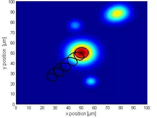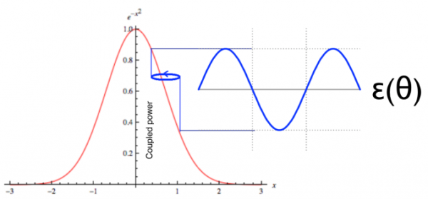 通過圓形抖動確定梯度的圖形描述,即調製觀察到的耦合功率(或其他量)。相對於抖動的調製相位表示朝向最大值的方向,而其幅度在適當情況下降至0