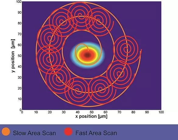 獨特之處在於,FMPA的區域掃描選項包括單頻正弦和螺旋掃描。這些掃描比傳統的光柵或蛇形掃描快得多,因為它們是真正連續的並且避免了傳統掃描中使用的停止和啟動運動的穩定要求,而且可以選擇頻率以避免激發結構共振。另外,還可以選擇恒速螺旋掃描,能夠在螺旋上以恒定密度采集數據。
