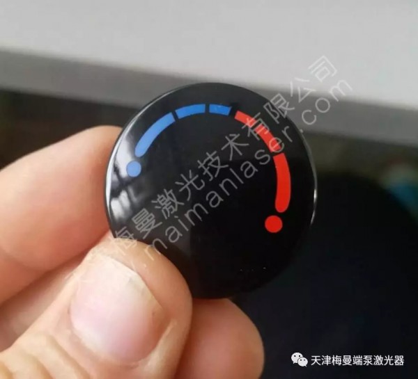 如圖,該產品至少有2層漆以上,每一層漆的厚度隻有幾個微米,需要控製激光刻掉表麵的黑色油漆,漏出下麵紅漆和藍漆,不能破壞下麵漆層,並要保證邊緣整齊,顏色鮮豔。