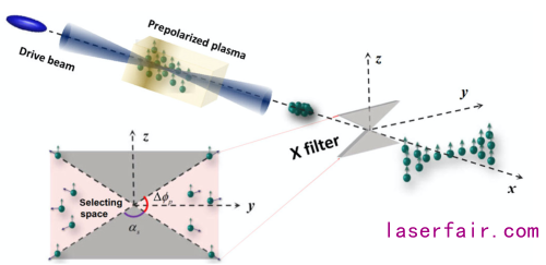 研究團隊獨立發展了包含自旋效應的粒子模擬方法,開展激光極化粒子加速研究。研究發現,激光尾場電子加速過程中,注入電子產(chan) 生的磁場使電子自旋發生進動,由於(yu) 每個(ge) 電子的注入位置、磁場方向與(yu) 強度均不相同,自旋進動無法同步,從(cong) 而使電子束發生退極化現象。進一步研究表明,對於(yu) 橫向預極化的等離子體(ti) 靶,電子束的自旋進動與(yu) 其在相空間的位置是相關(guan) 的,在特定的相空間區域電子的自旋進動受到顯著抑製。基於(yu) 上述研究,研究人員設計了一種X型過濾器,置於(yu) 加速完成的電子束之後,過濾掉進動顯著的電子,留下相空間中高極化率部分。該設計方案可以使得電子束極化率由最初的35%左右提升至80%以上。