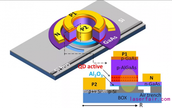兩(liang) 者都是多層結構,基本上由同心環組成,同心環形成一個(ge) 半導體(ti) 激光器,其中嵌入一個(ge) 氧化物基電容器。通過控製電容器上的電壓,不同數量的電荷在那裏積累。這改變了設備的光學模式指數,即當相位光沿波導傳(chuan) 播時,會(hui) 經曆多少延遲,從(cong) 而改變發射光的波長。