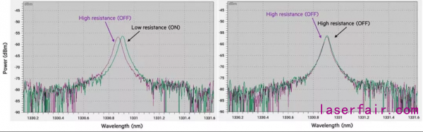 When the laser is in its low-resistance state, heat shifts its output to a longer wavelength.