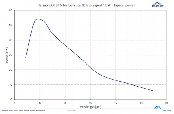 利用LeVante IR fs OPO的Signal和Idler光的調諧性能,APE公司的HarmoniXX DGF係統有非常好的調諧性能和效率,可以輸出4-15µm寬可調諧範圍,是顯微光學,材料學,電子學研究的理想光源!