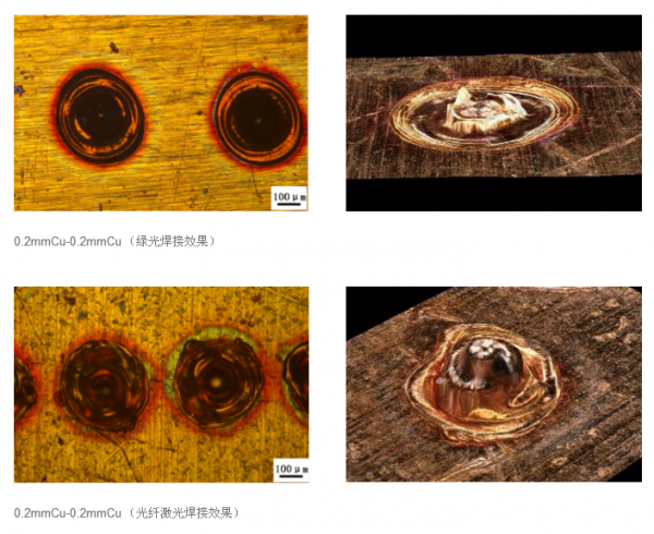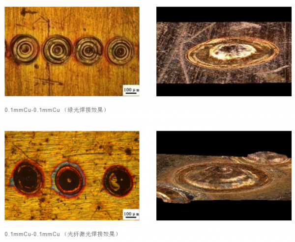 采用綠光激光分別對0.1mm厚紫銅與(yu) 0.1mm厚紫銅搭接焊,以及0.1mm厚紫銅與(yu) 0.2mm厚鋁合金搭接焊。焊後表麵無需清理,無飛濺產(chan) 生,焊點大小均勻,焊點成型好,焊接質量高,同時,在焊接過程中保持穩定,所需能量也更低。