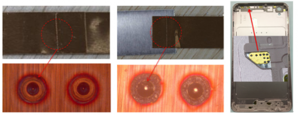 焊接難點:純金對傳(chuan) 統的紅外激光吸收極低,傳(chuan) 統激光焊接容易產(chan) 生飛濺,焊點大小不均、表麵粗糙。