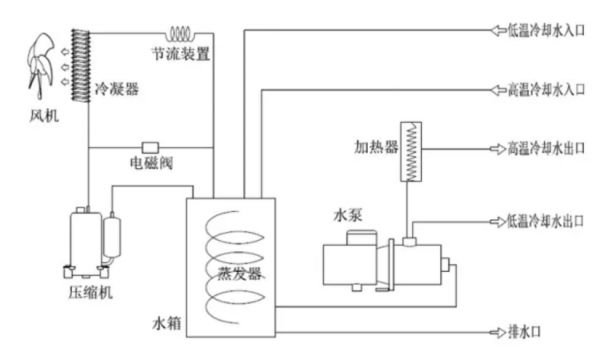 冷水機的主要工作原理是將電能轉化為(wei) 機械能,利用其自帶的壓縮機將過熱蒸汽壓縮成高溫高壓的氣體(ti) ,然後排向冷凝器並轉化成高壓液體(ti) ,再流經節流裝置(膨脹閥或毛細管) 降壓,最後變成低溫低壓的過冷液體(ti) ,低溫低壓的過冷液體(ti) 再進過蒸發器汽化吸熱成過熱蒸汽,再次回到壓縮機進入下一個(ge) 循環,實現製冷功能。