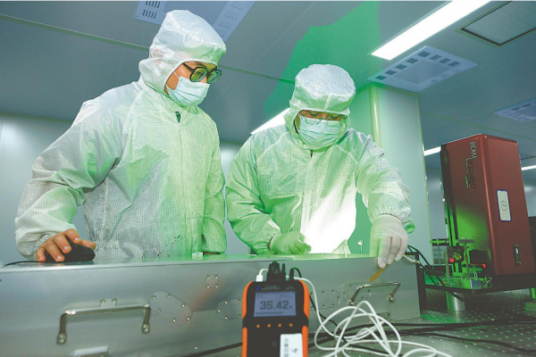 近日,在合肥廬陽經濟開發區華創鴻度光電科技有限公司激光器研發生產(chan) 車間,技術人員在測試綠光皮秒激光器光路。 自今年4月份新研發生產(chan) 車間啟用以來,該企業(ye) 先後完成...