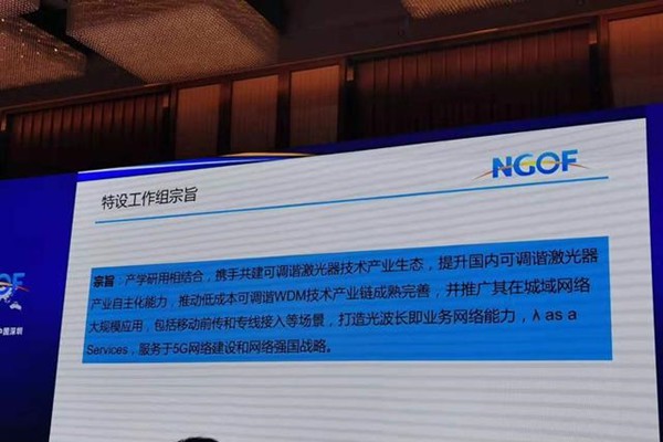 1月8日消息,今天,在新一代光傳(chuan) 送網發展論壇(NGOF)2019年度大會(hui) 上,可調諧激光器特設工作組正式宣布成立。隨著帶寬需求不斷增...