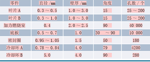 目前航空領域中用於(yu) 噴射引擎的氣體(ti) 溫度可達到2000℃,這個(ge) 溫度已經超過了渦輪葉片和燃燒室材料,即鎳合金的熔點,於(yu) 是人們(men) 一般采用邊界層冷卻的方法來解決(jue) 這個(ge) 問題,即在氣壓渦輪、噴管葉片和燃燒室表麵加工孔(見圖1),其中每個(ge) 零件上的孔從(cong) 25個(ge) 到4萬(wan) 個(ge) 不等(具體(ti) 零件的參數如表1所示),冷卻氣體(ti) 可以通過零件上的小孔覆蓋整個(ge) 零件的表麵來隔絕外界的溫度,從(cong) 而起到保護作用。