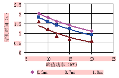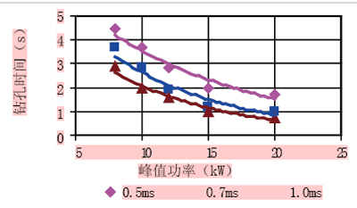 圖7 不同脈衝(chong) 寬度時的鑽孔時間 (與(yu) 表麵成20角,JK704LD1,O2 輔助)