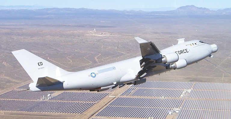 美國空軍(jun) 第一架機載激光武器以波音747-400F為(wei) 平台,隸屬於(yu) 美國空軍(jun) 愛德華茲(zi) 空軍(jun) 基地,編號00-0001。由導彈防禦局(MDA)、美國空軍(jun) 與(yu) 波音公司、洛克希德·馬丁公司、諾斯羅普·格魯曼公司合作研製。該飛機裝載了功率強大的高能COlL化學激光器,用於(yu) 摧毀處於(yu) 助推段的彈道導彈。