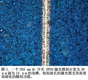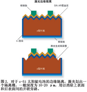 利用DPSS激光進行邊緣隔離不僅(jin) 更加環保,還提高了成品率和器件效率。特別由於(yu) 晶體(ti) 矽在這些較短的波長處可以吸收更多光,電流產(chan) 生係統現在更加依賴工作在可見光(532 nm)或紫外(355 nm)波段的DPSS激光器4。矽對355 nm光波的吸收量比對紅外(1064 nm)光波的吸收量大四到五個(ge) 數量級,因此利用#p#分頁標題#e#Q-轉換UV DPSS激光器(圖3)可以實現高度本地化的上表麵刻蝕。除射入深度較淺外,紫外波長還可以在較低的溫度下獲得較窄的溝槽,對外圍溫度損傷(shang) 如微裂紋盡可能少,微裂紋可能會(hui) 大大影響成品率。這就使溝槽能置於(yu) 距離器件邊緣較近的地方,減少“死”區,從(cong) 而使電池的效率最大化。