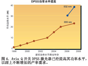 對於(yu) 激光工藝設備供應商而言,這意味著什麽(me) ?許多c-Si激光工藝,生產(chan) 線的產(chan) 出規模幾乎直接與(yu) 激光平均功率水平一致。因此,此處重要的推動力是由脈衝(chong) DPSS激光器提高平均功率水平,同時保持決(jue) 定工藝產(chan) 率和操作成本的特征。這包括光束的質量、產(chan) 品的壽命和脈衝(chong) 之間的穩定水平。圖4顯示出Q-開關(guan) 355和532nmDPSS激光器的功率是如何獲得提高,與(yu) 不斷增加的產(chan) 率需求保持同步。