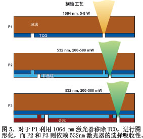 對於(yu) 薄膜麵板的生產(chan) ,DPSS激光器一般用於(yu) 形成分立電池隔離和互連線的剝離,它在麵板生產(chan) 階段,在每一層沉積的薄膜上都刻蝕多達數百條薄線條。這種刻蝕工藝通常用P1、P2、P3指代,統稱為(wei) 激光圖形結構(圖5)。此處不能僅(jin) 僅(jin) 通過提高平均激光功率就能實現產(chan) 能產(chan) 率的增加,而是它們(men) 也需要具備在不同材料的薄層上高度均勻刻蝕、掃掠大型麵板的功能6。
