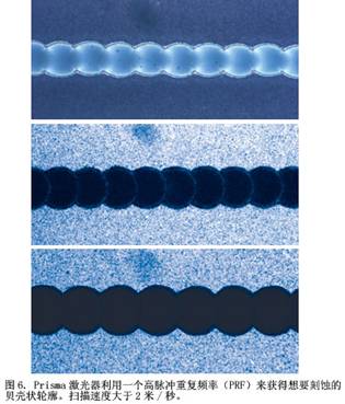 光學掃描技術的速度有限,意味著必須同時使用多個(ge) 激光束,因此平均功率要求是適中的。更關(guan) 鍵的要求是脈衝(chong) 重複頻率(PRF)。對大麵板的目標掃描速率為(wei) 2 米/秒時,PRF必須非常高(高達100 kHz甚至更高)才能獲得想要的貝殼狀輪廓(圖6),同時保持關(guan) 鍵特征,如較短的脈衝(chong) 寬度和優(you) 異的脈衝(chong) 之間的重複性。