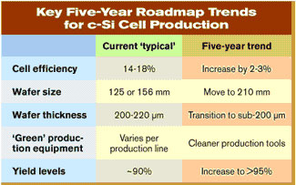 提高太陽能電池和麵板的效率幾乎是全球每位太陽能廠商最急於(yu) 實現的願望。大多數已提出的技術藍圖清晰指出,5年後晶體(ti) 矽(c-Si)太陽能電池的效率將增長3-5%,平均值將達到16-20%。對於(yu) 薄膜太陽能麵板,總體(ti) 效率較低,但也有望獲得相應提高。比如,從(cong) 單結非晶矽(a-Si)結構向串聯結a-Si/mc-Si(微非晶)結構轉化,通過提高光譜吸收率可將電池效率約提升4%,麵板總體(ti) 效率將提升至10%1。