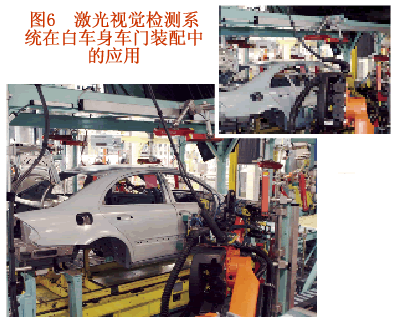 圖6所示為激光在線檢測技術在白車身車門裝配中的應用實例。其中機器人控製下的抓拾器與激光在線檢測係統通過控製,形成一個閉環係統,通過激光在線檢測係統在門蓋裝配過程中的實時動態測量,實時地把所測量數據與處理器中的標準數模數據對比,給出測量值與理論值的偏差,實時調整抓拾器的安裝位置,使其達到一個設計的最佳值,此時門與側圍的平度和間隙均會達到一個最佳值。