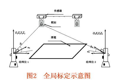 在實際應用 中,通常是將多個視覺傳感器組成一個視覺檢測站,每個傳感器首先計算出被測點在當前的傳感器坐標係中的坐標,然後將所有視覺傳感器坐標係匯聚在係統坐標係 下,從而完成測量。係統的工作主要建立在攝像機模型和立體視覺傳感器三維測量模型的基礎上。為了得到被測點在車身定位坐標係中的坐標,需要以標準坐標係為 中介,把被測點在傳感器坐標係中的坐標轉換到被測點在車身定位坐標係中,這就需要把傳感器坐標係、車身定位坐標係與標準坐標係統一起來,稱為中介坐標統一 法。完成上述工作是通過局部標定和全局標定的過程來實現的。局部標定是利用透鏡透視原理,標定出從世界坐標係到傳感器三維坐標係的12個外部參數;全局標定采用的是中介坐標係方案(圖2),通過采用靶標,求出測量傳感器所對應的傳感器坐標係到經緯儀坐標係的轉換矩陣,完成坐標係的統一。