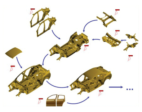 隨著汽車製造水平的不斷提高,激光視覺檢測站逐漸得到應用,一汽大眾汽車有限公司從每一個總成開始,均采用該係統進行尺寸控製,出現問題的部件會被及時 發現、報警並放回返修區。這樣可以保證每一級總成部件均由尺寸合格的下級總成組合而成。不僅如此,由於數據實行實時檢測、存儲,當發現問題時,製造部門可 以快速發現工裝夾具的問題所在,在最短的時間內進行調整(圖4)。