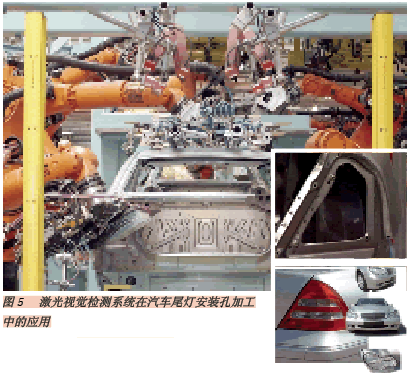 傳統工藝中燈安裝孔采用多個衝壓件焊接而成(如圖5所示),其累計誤差較大、且難以控製,導致後尾燈安裝後與側圍匹配質量較差、尺寸不穩定。采用激光視覺檢測技術,衝孔在各部件拚焊完成後進行,通過使用激光在線測量,將後尾燈左右的型麵形成數模,並與已經存儲於控製器中的數模相對照,找出最佳匹配尺寸並調整機器人完成衝孔工藝。