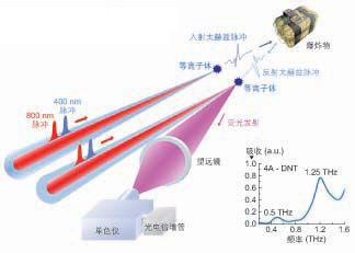 該技術的核心思想是利用與(yu) 太赫茲(zi) 波相互作用的全向熒光發射。其信號探測方法足夠靈敏,可以在10米遠處時域分辨太赫茲(zi) 脈衝(chong) ,同時具備最弱的水蒸氣吸收,且不受方向性限製。