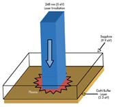 LED激光剝離的基本原理是利用外延層材料與(yu) 藍寶石材料對於(yu) 紫外激光具有不同的吸收效率。藍寶石具有較高的帶隙能量(9.9 eV),所以藍寶石對於(yu) 248nm的氟化氪(KrF)準分子激光(5 eV輻射能量)是透明的,而氮化镓(約3.3 eV的帶隙能量)則會(hui) 強烈吸收248nm激光的能量。正如圖4所示,激光穿過藍寶石到達氮化镓緩衝(chong) 層,產(chan) 生一個(ge) 局部的爆炸衝(chong) 擊波,在氮化镓與(yu) 藍寶石的接觸麵進行激光剝離。基於(yu) 同樣的原理,193nm的氟化氬(ArF)準分子激光可以用於(yu) 分離氮化鋁(AlN)與(yu) 藍寶石。具有6.3 eV帶隙能量的氮化鋁可以吸收6.4 eV的ArF激光輻射,而9.9 eV帶隙能量的藍寶石對於(yu) ArF準分子激光則是透明的。